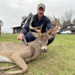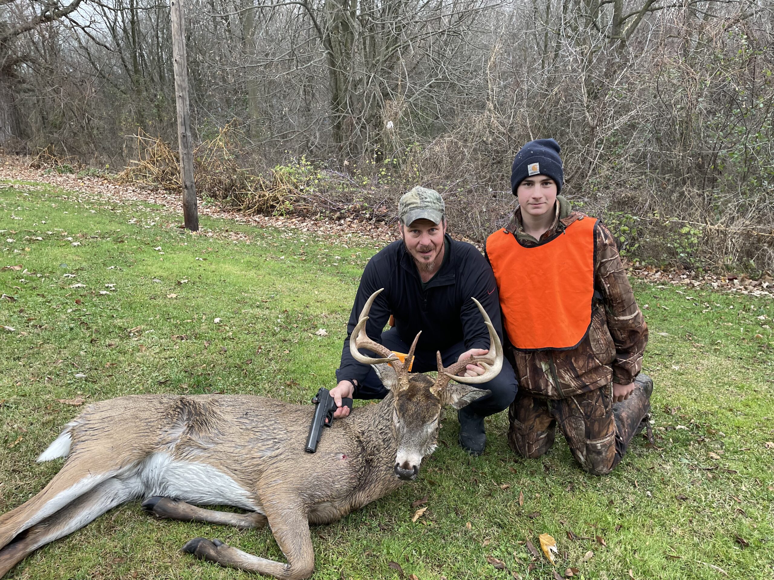 I shot this buck on November 28, 2023 on the old farm. I climbed into big willow tree that had a large branch that was about 8 feet off the ground. I was in a piece of property we call the “The Triangle.” As soon as I was on the big tree limb, I set down my muzzleloader. Not even a minute later the buck came sneaking down the edge of the railroad track. Before I could reach for my muzzleloader, he was under 5 yards from me and getting closer! It was impossible for me to get my muzzleloader so I pulled my pistol from my hip holster and shot him at three yards! He spun and ran back where he came from.