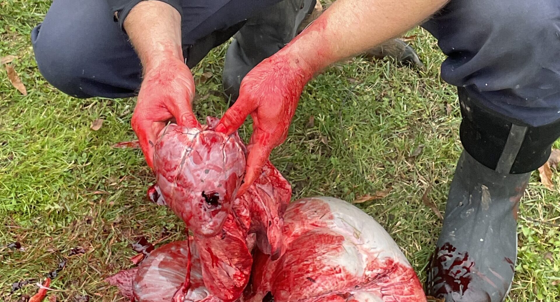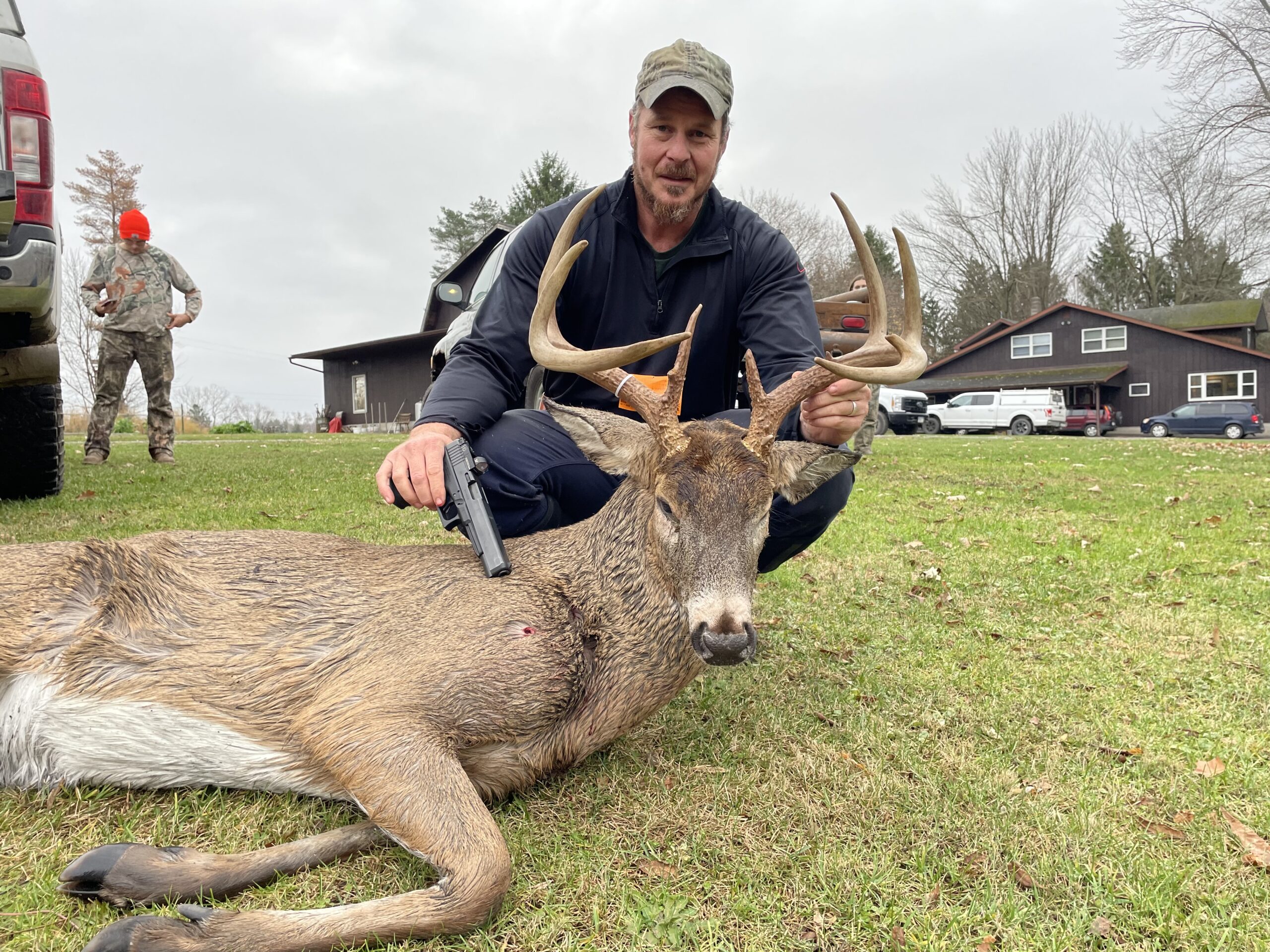 There was no blood trail as I hit him high in the front shoulder with no exit wound. He died within 30 yards. I found the pistol slug in the opposite shoulder where it stopped after going through his heart. An Amazing Morning in the woods!